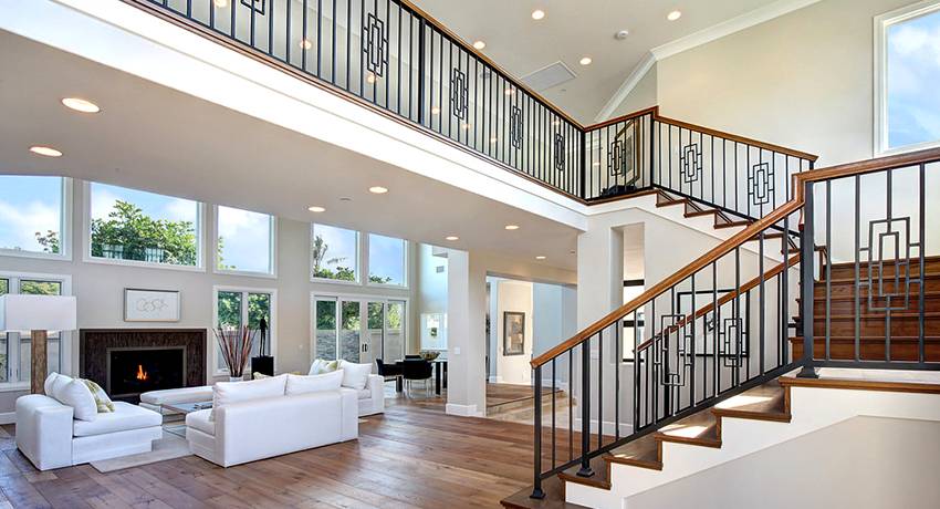 С каждым годом набирает популярность стиль модерн. Ограждения, оформленные подобным образом, отличаются сочетанием функциональности и изящества, что можно увидеть на фото. Кованые перила в доме такого типа содержат декоративные элементы, но не перенасыщены ими.