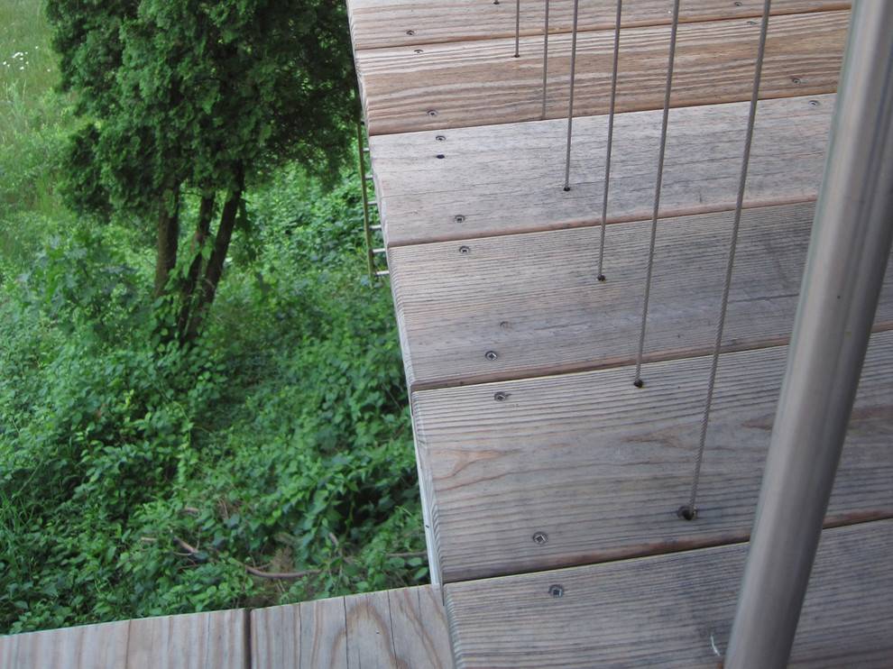 При такой конфигурации следует внимательно соотносить расстояния между тросами с шириной досок площадки, чтобы не допустить попадания троса в щель.