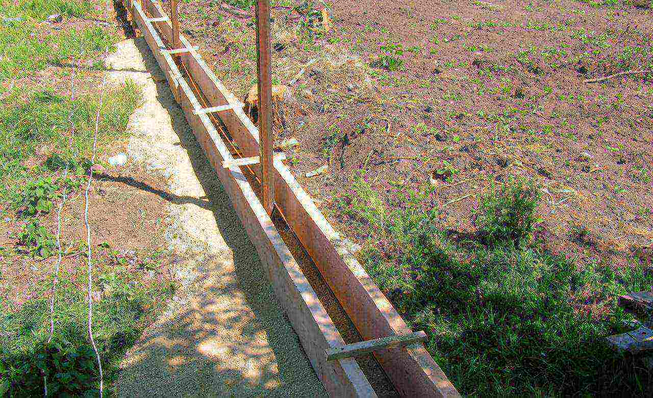 Канава под забор выкапывается со значительным запасом по ширине. Например, если толщина заливки определена в 30 см, то ширина канавы должна составить 50-60 см. Это связано с необходимостью креплений щитов боковыми брусками, которые вкапываются в грунт на 30-40 см глубже опалубочных щитов. Как и разметку, выемку грунта производят по всей линии будущего забора. Общая глубина землекопных работ должна на 10-15 см превышать заглубленную часть опалубки. Как мы помним, бетон непосредственно на слой почвы заливать нельзя, потребуется гравийно-песчанная подушка под бетонным слоем.