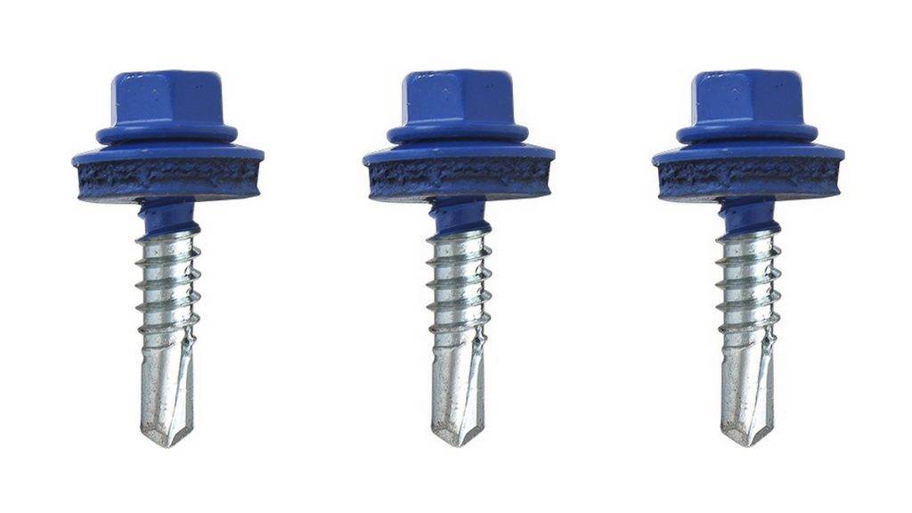 Шляпка кровельных саморезов имеет вид пресс-шайбы. Высоты бортиков должно быть достаточно, чтобы они прочно и правильно удерживались в бите шуруповерта в процессе ввинчивания. Метизы снабжены особой уплотнительной шайбой. Резина из неопрена предотвращает протечки в местах фиксации профилей. Шляпка изолирована не только снизу, но и сверху специальным антикоррозийным покрытием. Крепление профнастила можно осуществлять и при помощи шурупов, имеющих плоскую головку. Под нее обязательно нужно установить уплотнительные прокладки из резины. Конец саморезов имеет форму сверла, поэтому нет необходимости в предварительном просверливании металлических листов или прогонов. Для большей точности крепежа точку крепления рекомендуется сначала накернить.