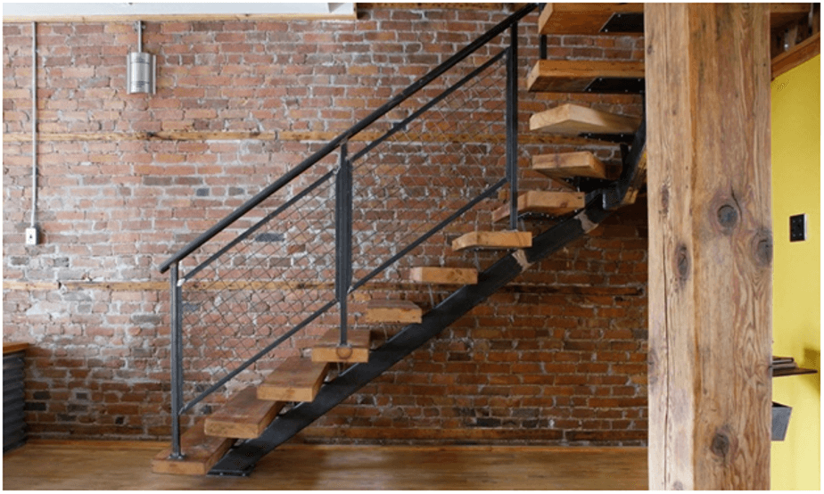 Стиль лофт не теряет своей популярности, поэтому при проектировании дома следует обратить на него внимание при постройке лестницы. В данном случае в качестве ограждения могут использоваться металлические опоры в виде сетки