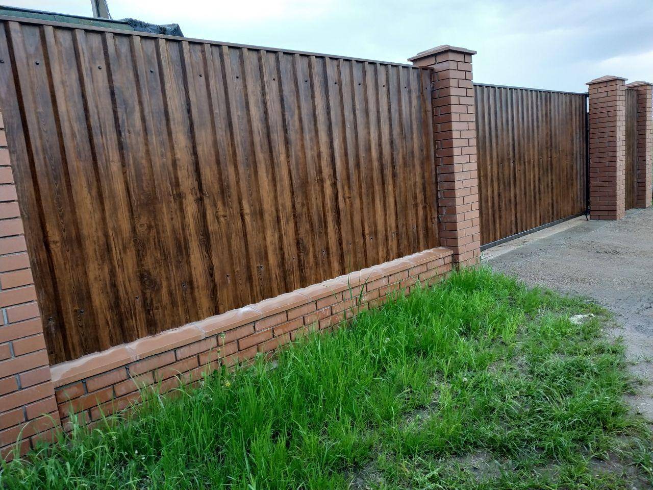 Выбор за вами: крепить забор в виде штакетника или монолит. Каждый из вариантов при верном выборе цвета сочетается с текстурой кирпича.