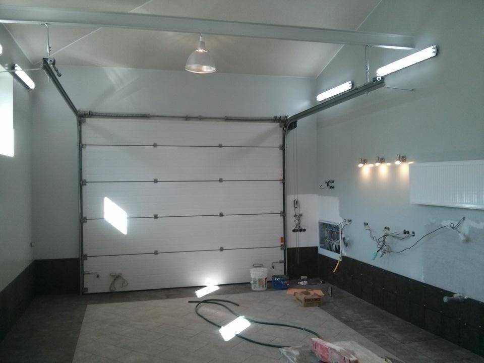 Если конструкция потолка не позволяет закрепить на нем осветители, их можно разместить на туго натянутых струнах. Но можно обойтись и настенным вариантом, установив осветители под потолком на стенах гаража.