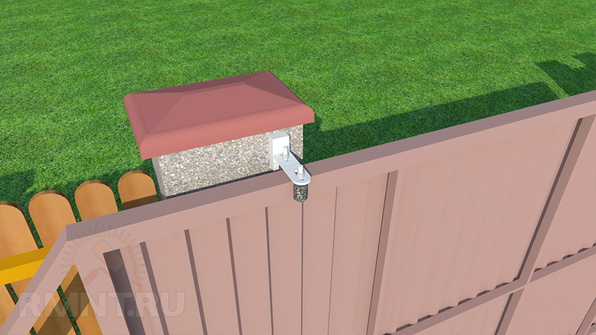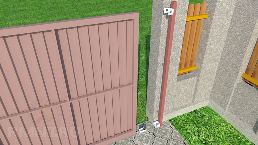 С противоположной стороны проезда, рядом со столбом забора, установите столб для крепления верхних роликов и уловителей (нащельник). Его можно забетонировать, а можно приварить к закладным конструкциям из уголка, вмонтированным в столб забора.