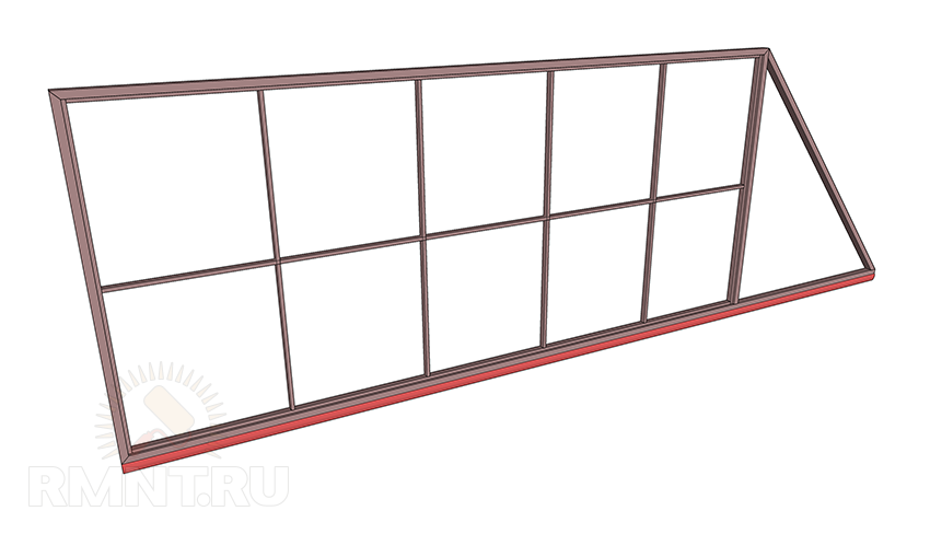 От свободного конца основания к ближайшему углу приварите трубу 60х40 мм длиной 2,56 м. Площадь полотна заполните конструкцией из труб 40х20 мм по схеме. При этом узкую трубу нужно варить заподлицо с широкой — при односторонней обшивке и по центру — с двухсторонней.