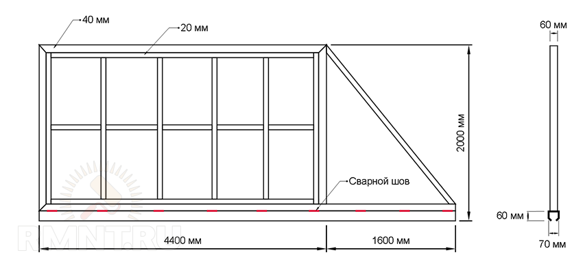 К направляющей (необходимо купить), закрытой с двух сторон заглушками, приварите трубу 60х40 мм длиной 6 м, прихватывая с двух сторон через каждые 750 мм. Перпендикулярно к основанию приварите (также точечно) трубы 60х40 мм длиной 2 м (подрезав края под 45°) и соедините их верхушки трубой длиной 4,4 м.