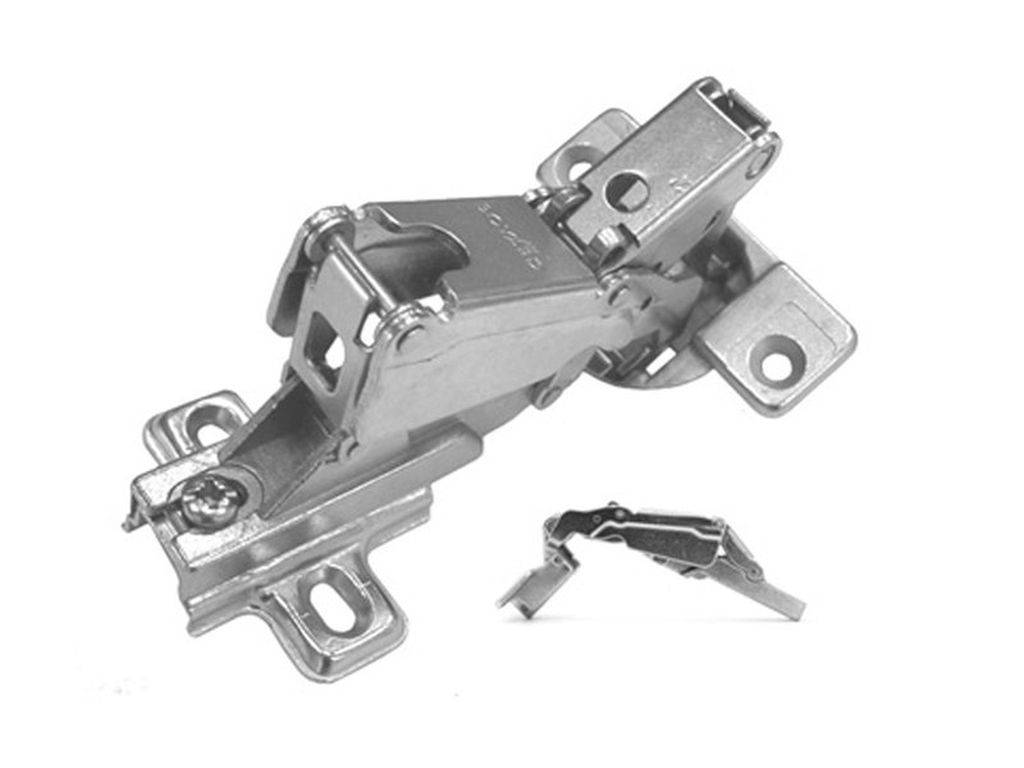 Имеет все характеристики четырехшарнирной петли, только без врезки чашки в корпус фасада. Крепится саморезами, поэтому подходит только для полотен с плотной текстурой.