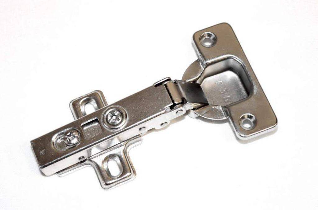 Накладные петли отличаются и углом наклона. Это необходимо для установки дверей угловых шкафов. В зависимости от отличия угла расположения фасада перпендикуляру стойки можно подобрать петли с углом открывания: -25 °, 30 °, 45 °, -45 °, 90 °.
