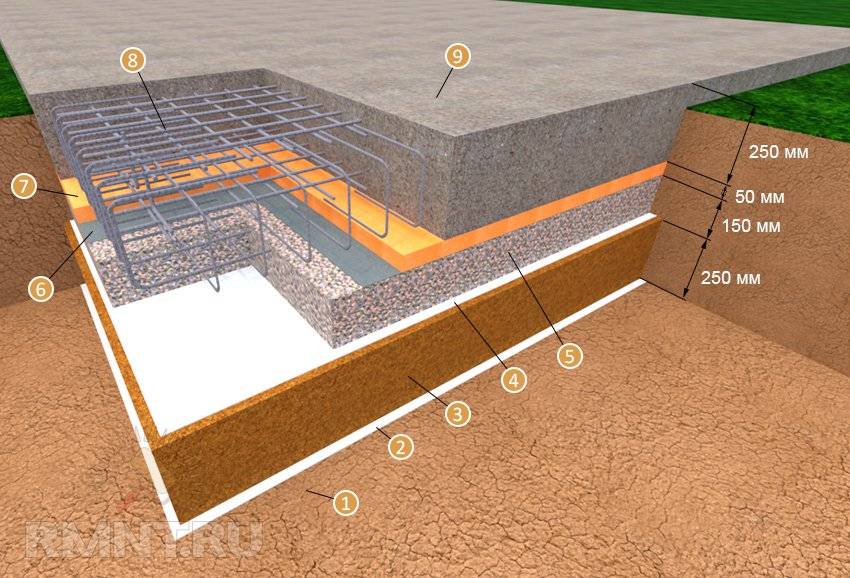 Схема плитного фундамента: 1 — уплотнённый грунт; 2 — геотекстиль; 3 — песчаная подушка; 4 — геотекстиль; 5 — гравийная подушка; 6 — гидоизоляция; 7 — теплоизоляция (пенополистирол); 8 — армирование; 9 — монолитная плита