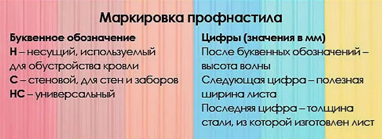 Профилированный лист, в зависимости от формы и высоты профиля, разделяется на три основные группы. Это стеновой профнастил, который маркируются буквой С, несущий профлист, обозначаемый буквой Н и универсальный металлический профиль, маркируемый буквами НС.
