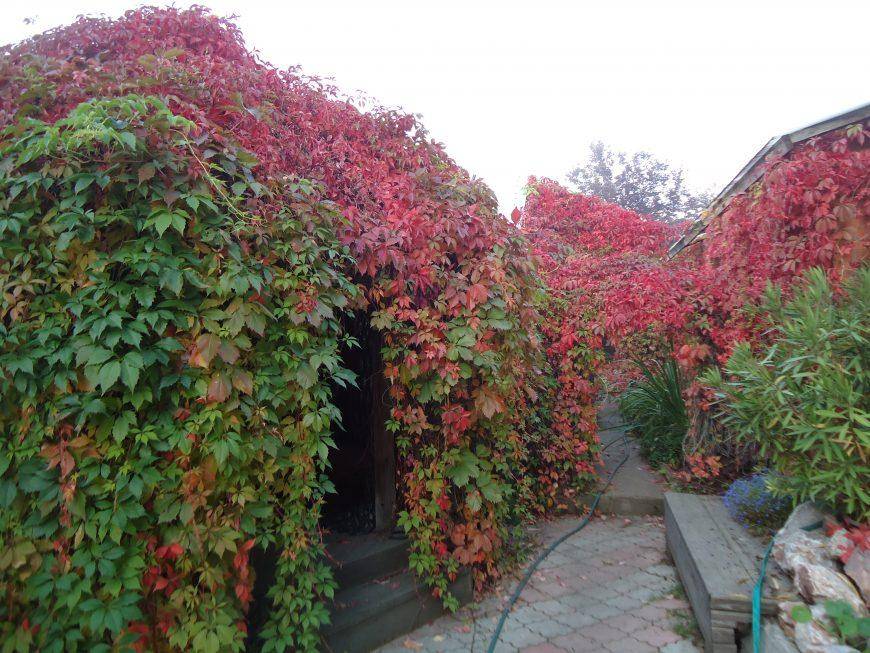 Дикий виноград на заборе украшает усадьбу в любое время года. Растение легко переносит как засуху, так и переувлажнение, не требует укрытия на зиму.