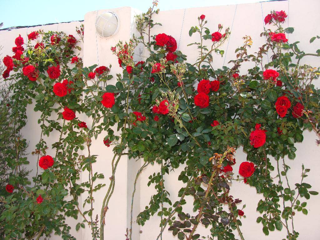 Самые красивые вьющиеся растения, идеальный вариант для создания привлекательного дизайна сада. Отличаются богатой цветовой палитрой, многолетние. Это растение неприхотливо в уходе, требует хорошо освещаемого места и обильного полива. Цветут розы 3-4 недели, обычно в первой половине июня. В остальное время имеют густую зеленую листву. Можно посадить вдоль забора несколько сортов роз, создав красивую комбинацию разноцветных и разных по форме цветков.