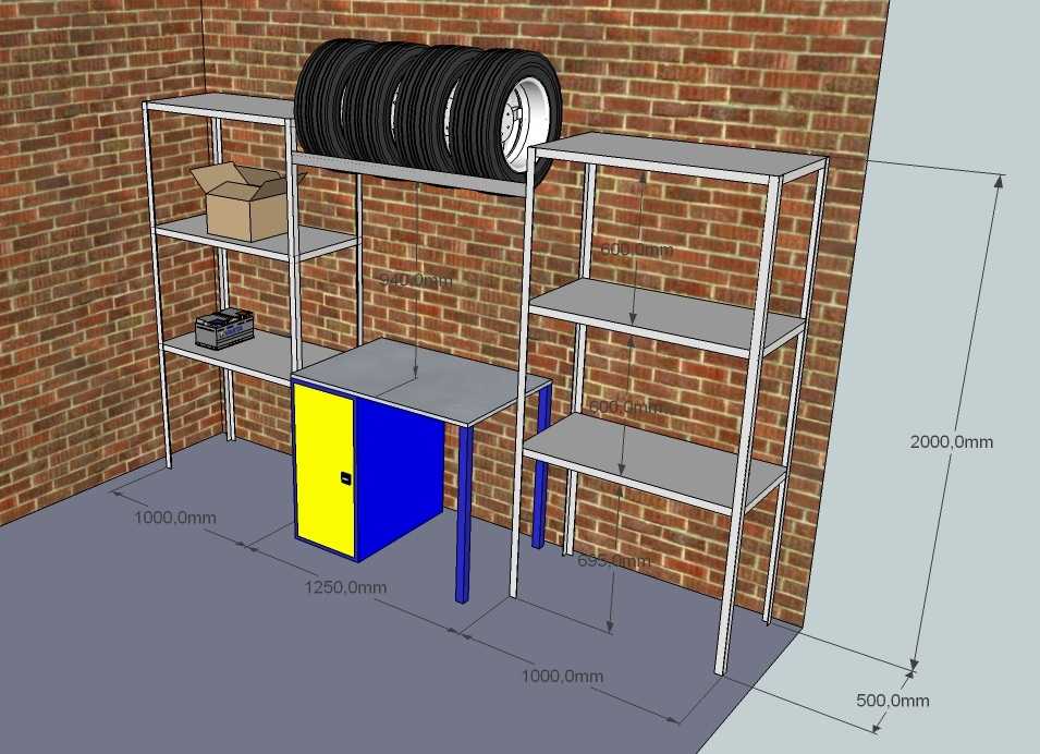 Расположение может меняться по усмотрению хозяина гаража. Место для колес седана можно предусмотреть в верхней части стеллажей, чтобы не занимали ценную площадь на полу. Тяжелые и крупногабаритные колеса внедорожника лучше оставить внизу, чтобы не пришлось поднимать тяжести.