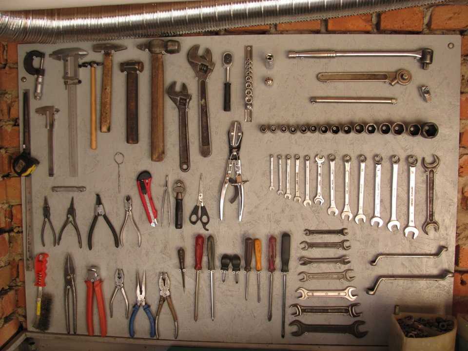 Стенд для инструментов проще всего приобрести в уже готовом виде. Он представляет собой перфорированный металлический лист, на который навешиваются держатели.