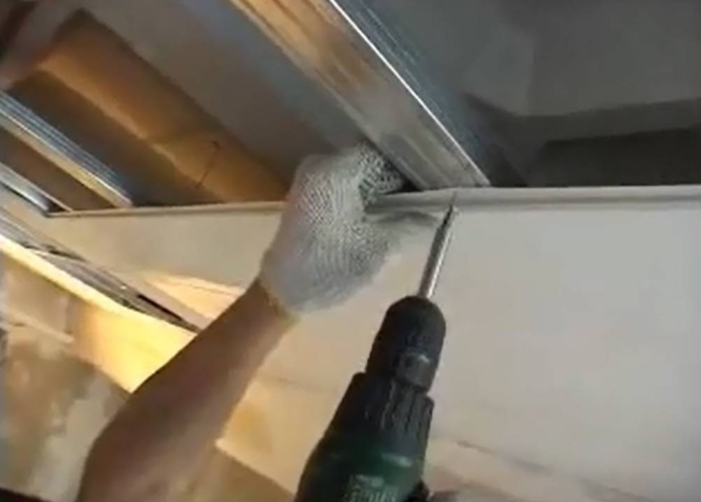 - Затем потолочный профиль крепят к направляющим и подвесам небольшими саморезами.