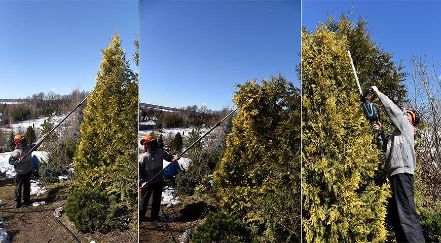Обрезка высокой туи с помощью высотореза и аккумуляторного секатора