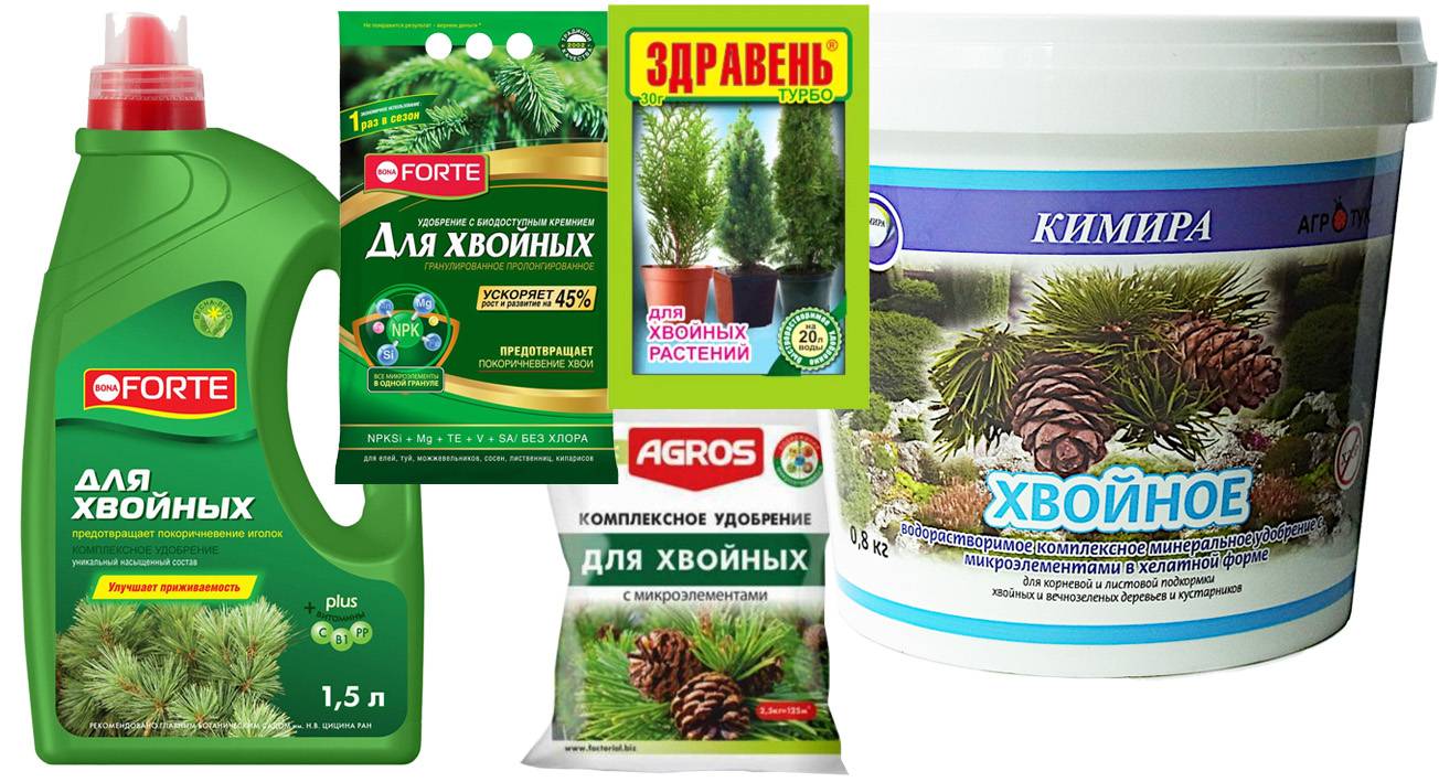 - Вносить подкормку нужно с конца весны по начало осени. Лучше всего подходят специализированные составы для хвойных культур.