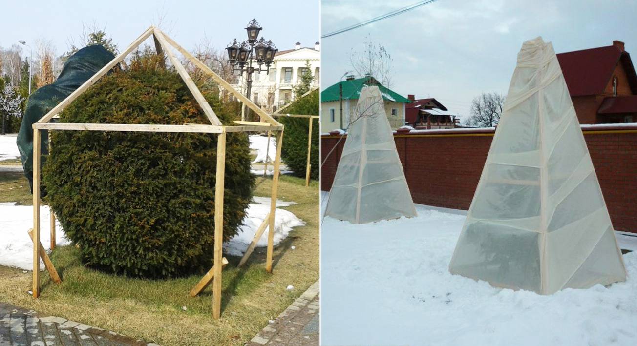 Укрытие позволит не задерживаться снегу на верхушке туи, он будет скатываться. Если не организовать укрытие, то верхушка может деформироваться, а широкие раскидистые экземпляры растений (например, шаровидная форма) приобретут непривлекательный вид, ведь снег продавит центр, раздвинув ветви, и в итоге образуется пустота. В этом случае крону предварительно можно зафиксировать веревкой.