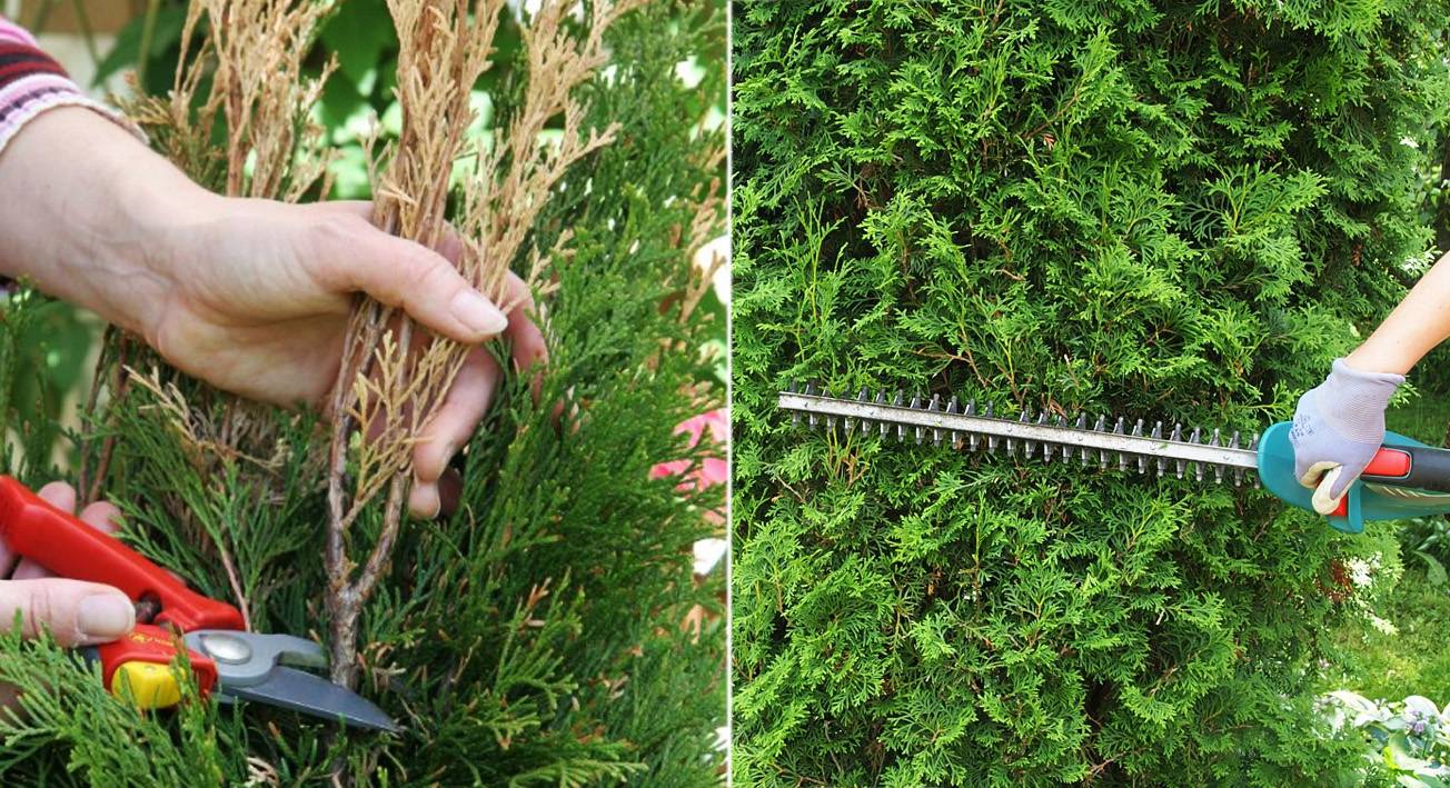 Чтобы крона туи выглядела эффектно, необходимо придавать ей форму. Стрижке подвергаются только те деревья, которые были посажены не менее 2 лет назад. Во время первой обрезки тую избавляют от сухих, повреждённых и больных ветвей, помимо этого определяют уровень загущения кроны. Поэтому первая обрезка выполняет больше санитарную функцию.