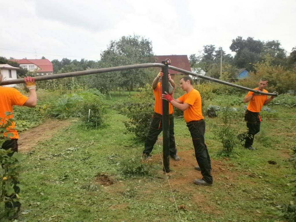 Для получения лучшего результата необходимо, чтобы один человек следил за вертикальным положением опоры, а два вкручивали с помощью рычага сваю.