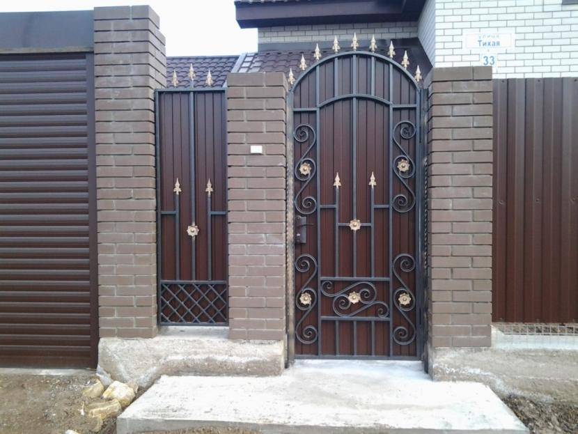 На небольших дачных участках часто устанавливают ворота с калиткой из профнастила. Все операции по сборке рамы калитки, встроенной в полотно ворот, выполняются так же, как и описанные выше. Изменению подвергается конструкция ворот, в которых должен быть предусмотрен проем для установки. Кроме того, необходимость встраивать калитку накладывает определенные ограничения на ее высоту.
