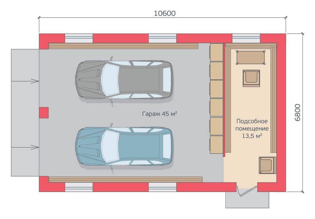 Эти показатели нужно умножить на два, а затем прибавить расстояние между машинами. От этого показателя теперь можно отталкиваться, добавляя площадь, необходимую для размещения полок, стеллажей и свободного перемещения по его периметру. Нужно также учесть, что минимальный промежуток между стенами гаража и автомобилями не должен быть менее 50 см. Этого требуют утвержденные законодательством строительные нормы.