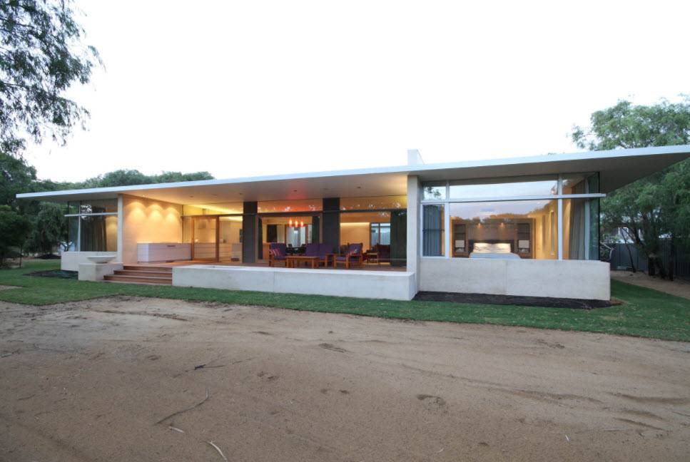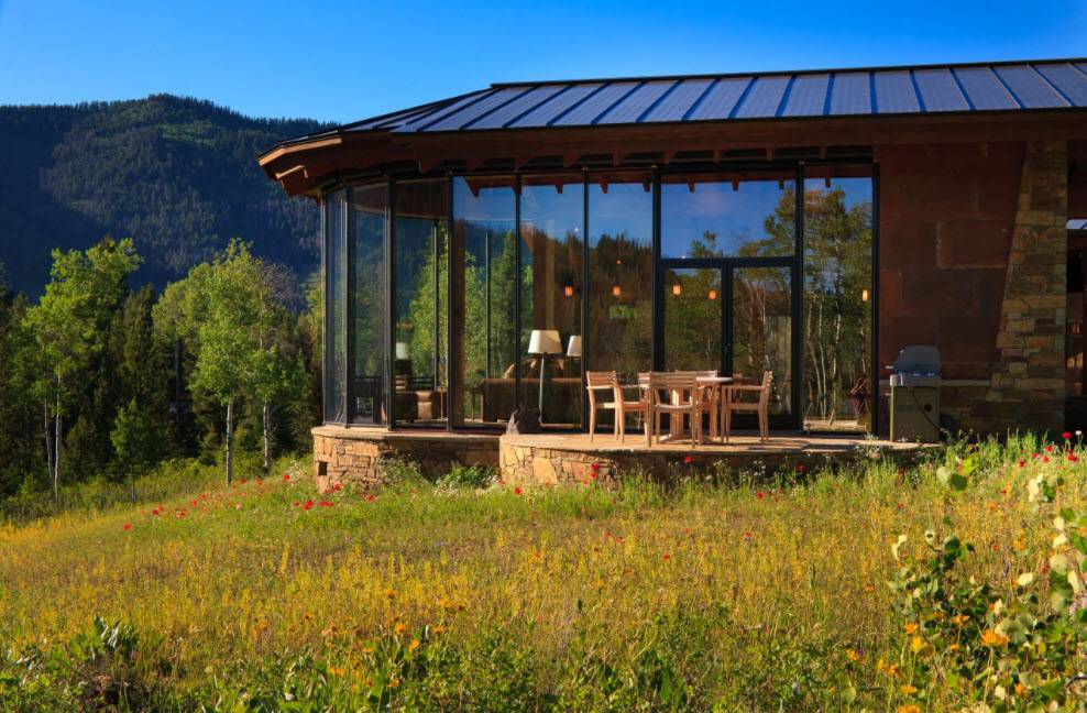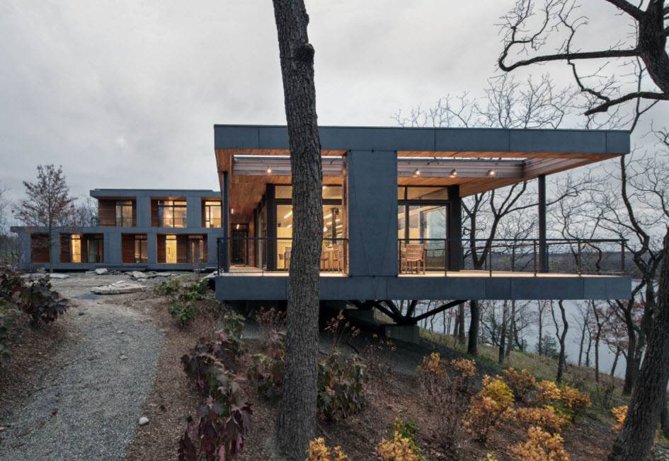 Стеклянные фасады, которые изгибаются внутрь, создают на северной стороне вход, а на южной стороне – крытую террасу с панорамным видом.