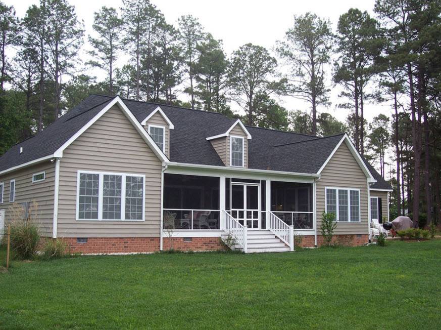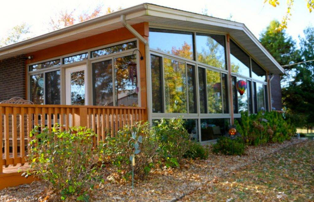 В классическом случае одноэтажный дом с пристроенной террасой располагают под одной крышей, если же захотеть сделать оригинальный и привлекательный вариант, то можно застеклить террасу, что будет особенно актуальным в зимний период времени.