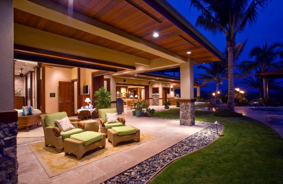 Это приемлемый вариант для всех регионов. Расположенные террасы с подветренной стороны обеспечивают хорошую освещенность и возможность отдыхать на открытом воздухе. Чтобы не подстраиваться под погодные условия устанавливается временный навес. Для открытых площадок применяют зонтики, переносные тенты. Проемы во время жары закрывают ролетами, легкими шторами.