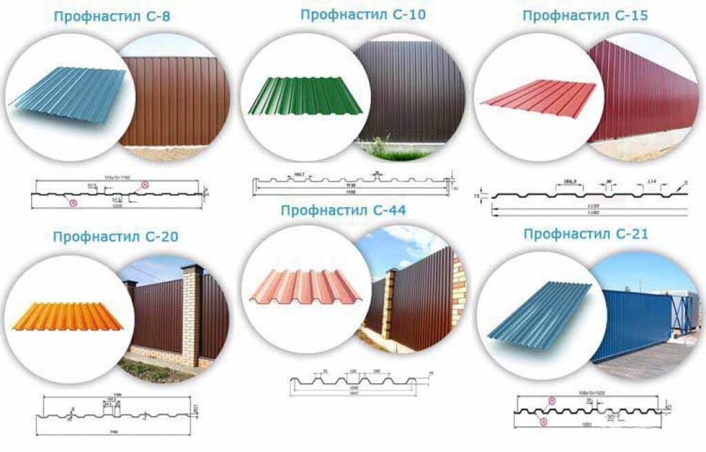 Существуют различные виды профнастила для забора. Основным параметром различия заборов служит высота волны. Профлист для забора имеет маркировку «С» и цифру, соответствующую этой высоте. Чем выше цифра марки профнастила, тем больше толщина и устойчивость ограды.