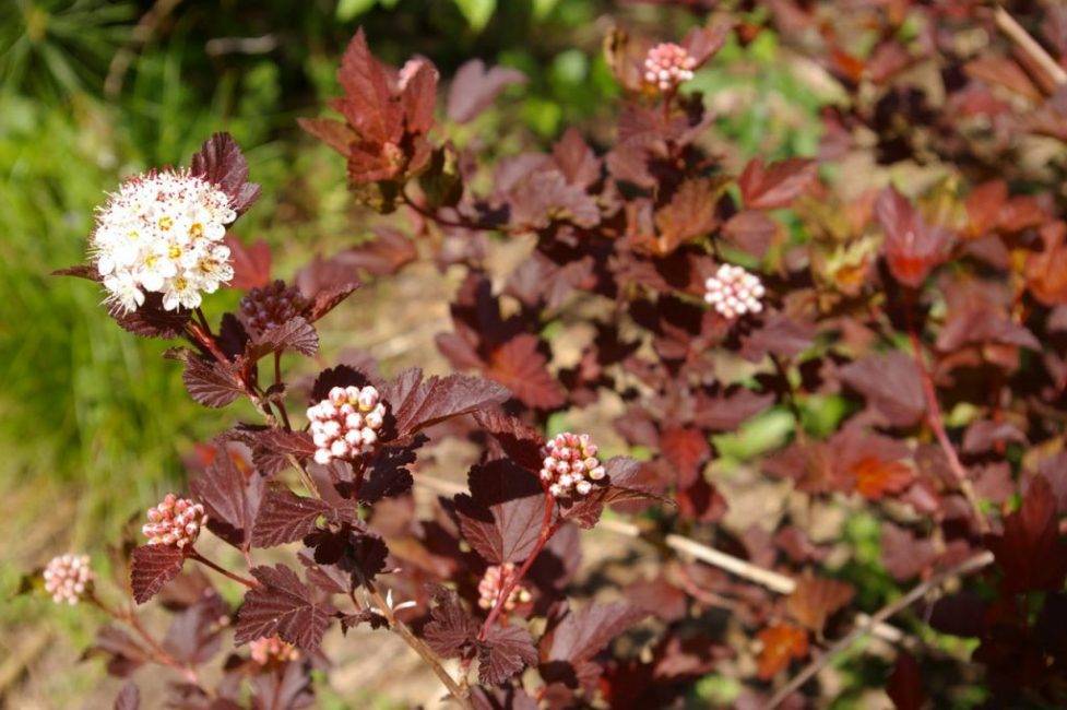 Пузыреплодник Schuch имеет листву красно-винного оттенка и цветет в конце весны бело-розовыми цветками.