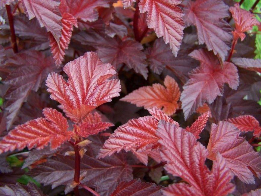Эта группа особо ценится садоводами и дизайнерами за высокие декоративные качества. Листва этих пузыреплодников, окрашенная в разные оттенки красных и пурпурных тонов, выглядит очень празднично. На фоне листьев эффектно смотрятся бело-розовые соцветия летом и гроздья ягод осенью.