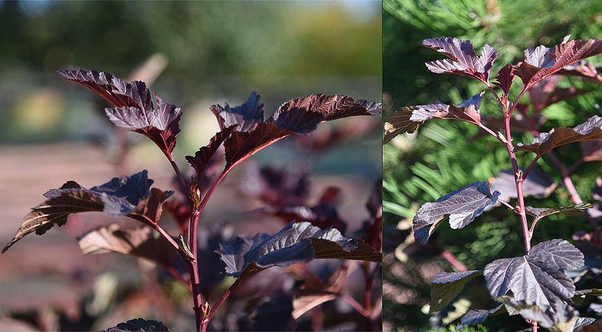 Наиболее интенсивная окраска листа у Диаболо проявляется на солнечном месте, в тени листья зеленеют.