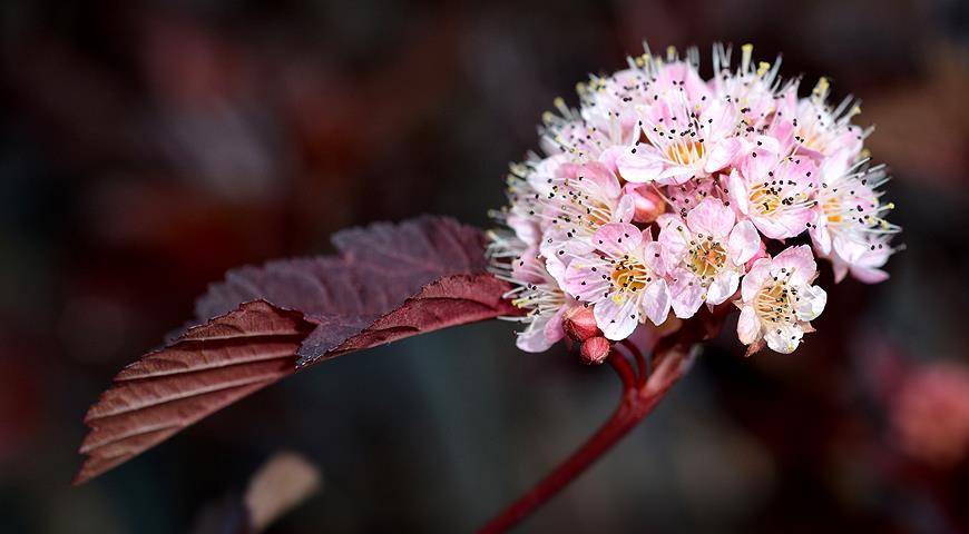Более компактная форма предыдущего сорта Диаболо, куст высотой и шириной около 1,5 м. Листья темно-бордовые, цветки розовато-белые.