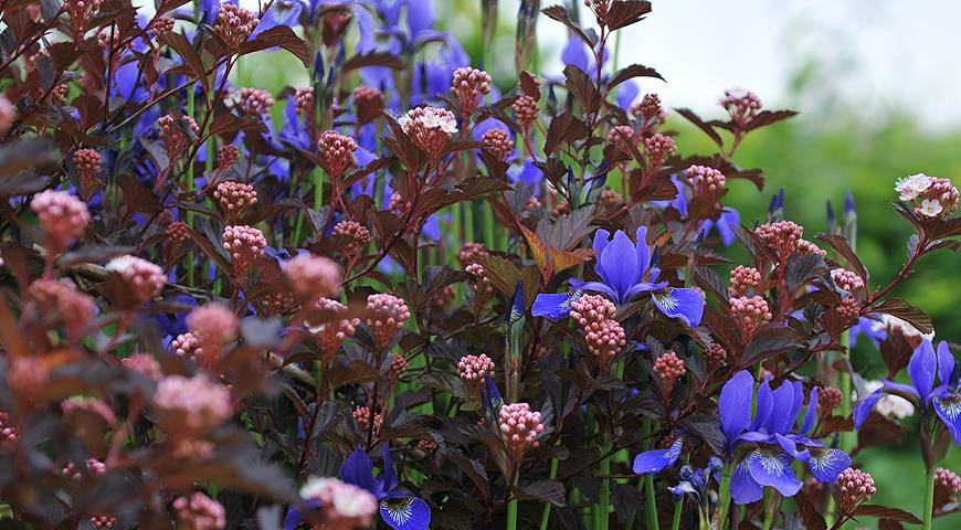 Пузыреплодник в ландшафтном дизайне сада сочетается, как друг с другом, родственными сортами, так и с травянистыми и кустарниковыми формами.