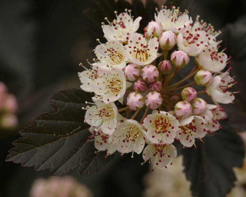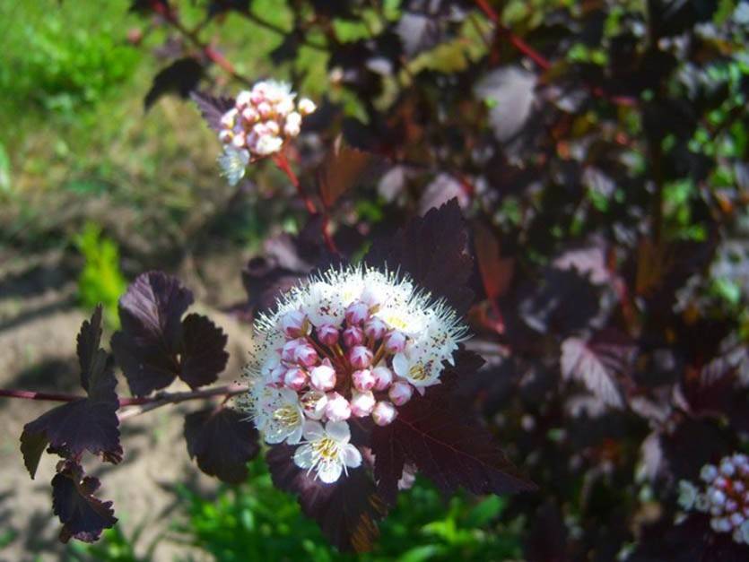 («Diabolo»). Раскидистый кустарник в высоту около 3 м с темными, пурпурными листьями. Если пузыреплодник Диабло посажен в тени, то листья делаются зелеными с пурпурным оттенком.