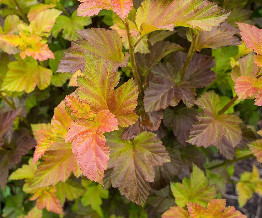 Помимо традиционной зеленой расцветки листья пузыреплодника могут быть окрашены в самые разнообразные тона: