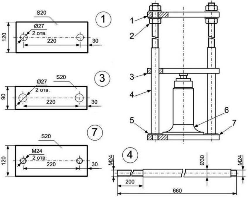 Схема изготовления : 1 — верхняя силовая платформа, 2 — гайки, 3 — нижняя платформа, 4 — шпильки диаметром 30 мм, 5 — нижняя резьба шпилек, 6 — гидравлический домкрат бутылочного типа; 7 — основание толщиной 20 мм