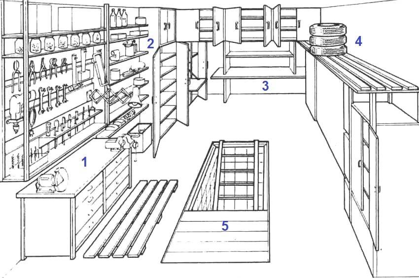 Пример размещения в гараже полезных приспособлений: 1 — с ручными станками, 2 — стеллажи и шкафы, 3 — стол для проведения различных ремонтных работ, 4 — полка для хранения шин, 5 — смотровая яма
