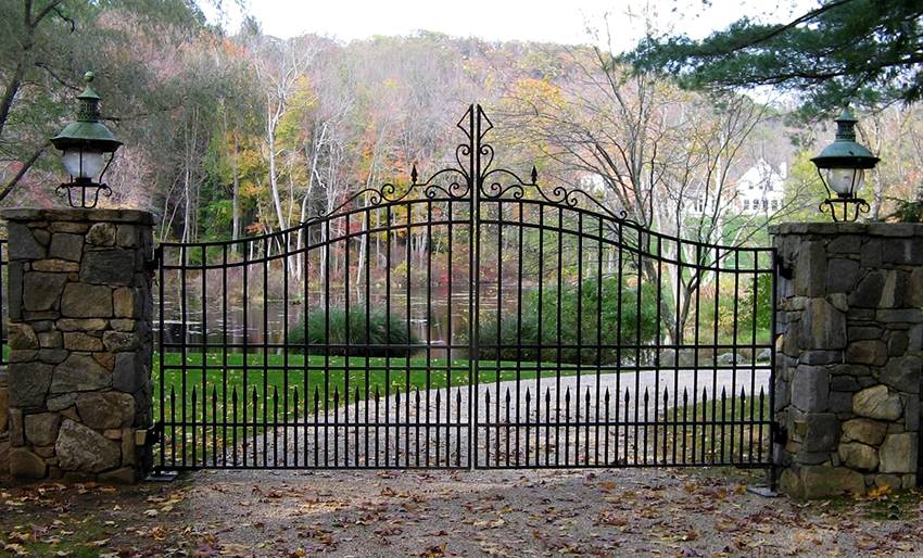 Створки делают деревянными или коваными, желательно с металлическими элементами (петлями, замками, навесами). Столбы — каменными (песчаник, известняк), в качестве компромисса выберите окрашенный в белый цвет кирпич.