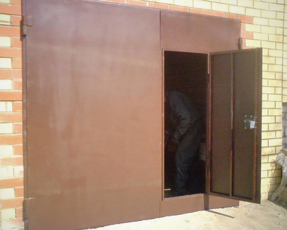 - Главное предназначение – защита от несанкционированного проникновения. Желательно обшивать поверхности створок оцинкованным металлом минимальной толщины 3–5 мм. Для усиления конструкции делают прочные запоры. Также не станут лишними бронированные накладки.