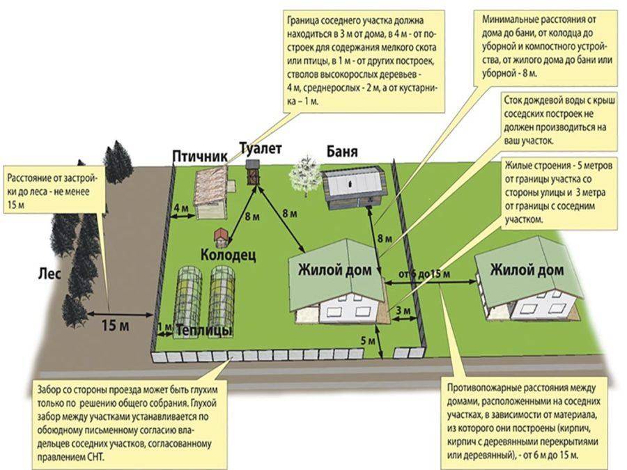 - Планировка, допустимые дистанции между объектами, дорогой в садоводческих объединениях.