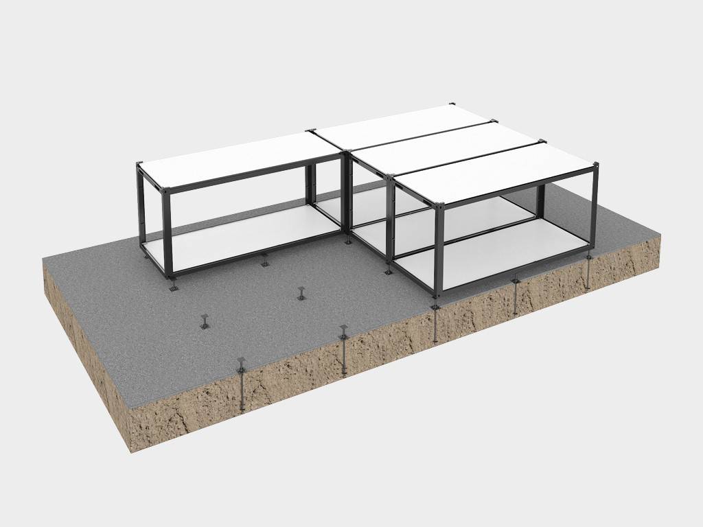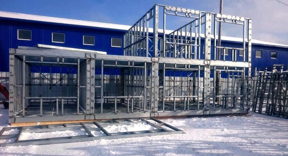 Модульные сооружения сборно-разборного типа предполагают использование специальных блоков-контейнеров. Это элемент общей конструкции, легко поддающийся модернизации. В качестве несущей основы выступает металлический прочный каркас, чаще всего имеющий стандартные размеры 6*2,5*2,5м. Рама из гнутого профиля закрепляется специальными стойками углового типа. На полученный каркас крепят специальные сэндвич-панели.