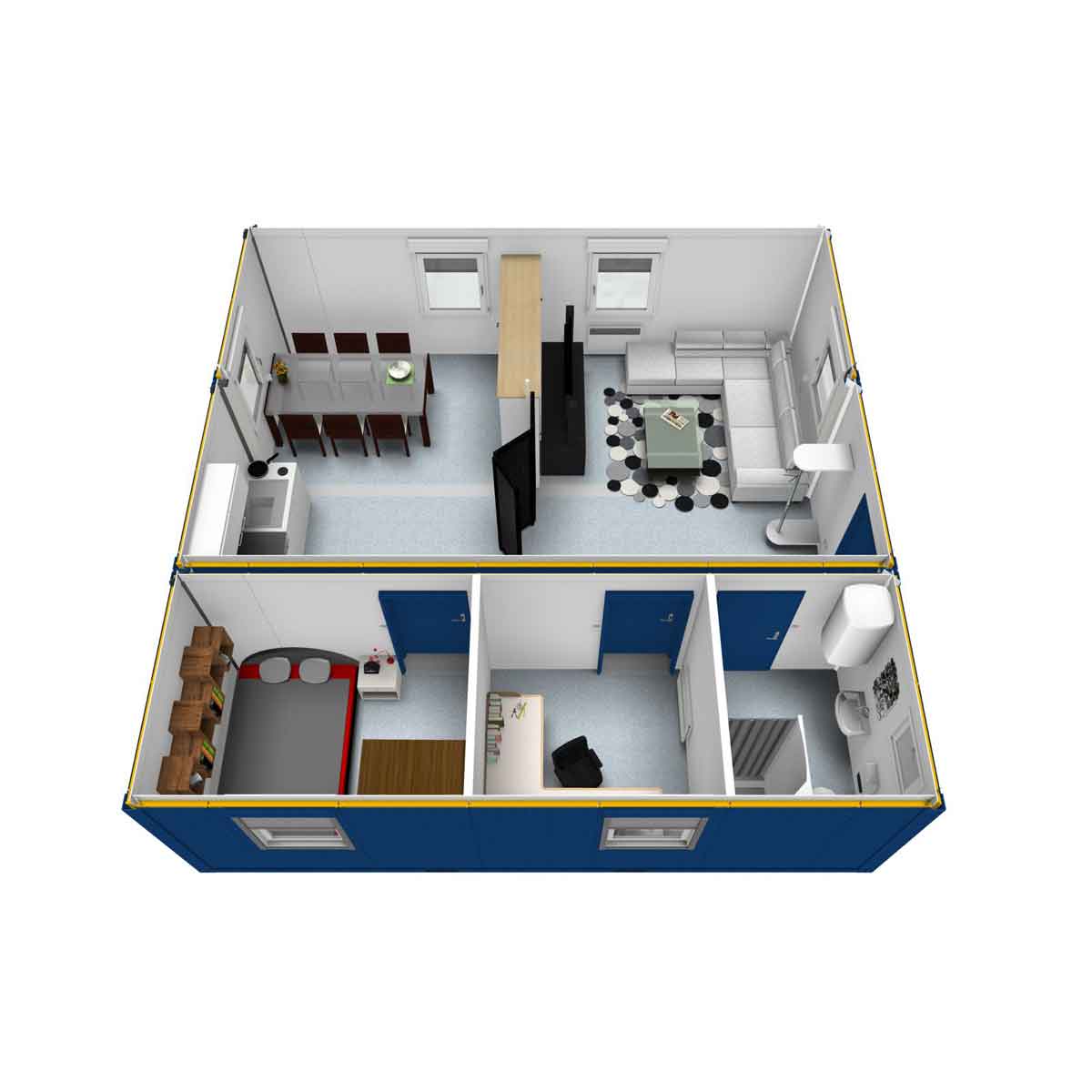 Вариант из двух модулей предполагает получение идентичной по квадратуре площади квартиры. Такое жилье предполагает не только санузел, но и гостиную, просторную спальню. Что касается третьего варианта, то такой дом подойдет для проживания средней по численности семьи. Габариты такого объекта сравнимы с небольшим коттеджем.