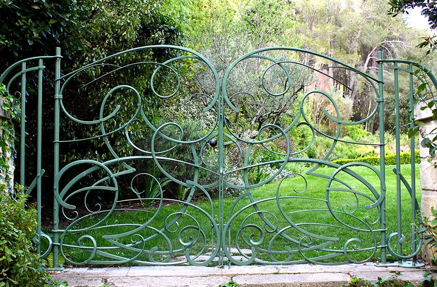 Главное условие — ворота не должны быть глухими. Предпочтение отдают сварным металлическим конструкциям с абстрактными геометрическими или растительными узорами.