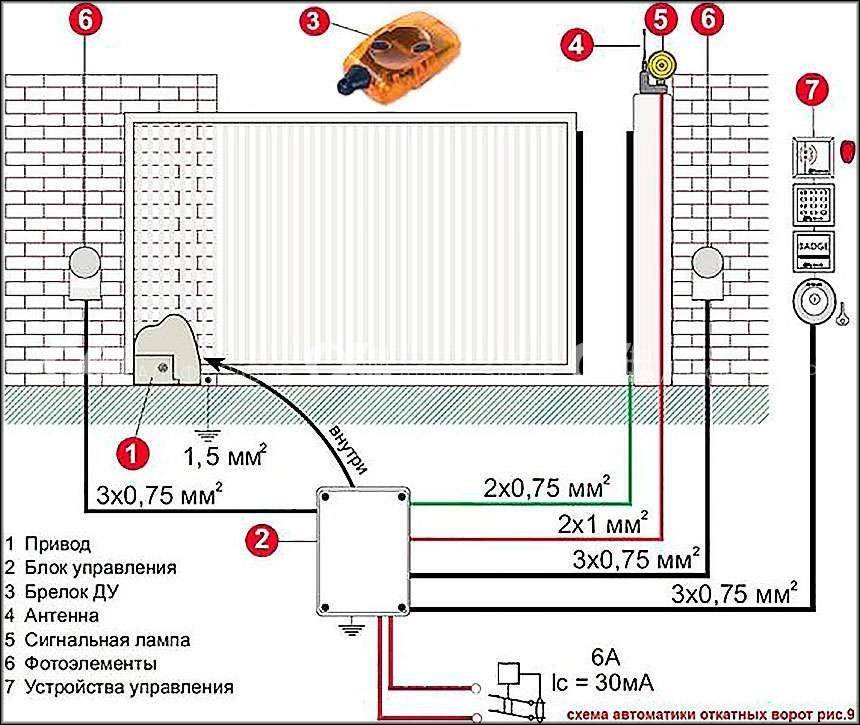 Откатная панель снабжается узлом с датчиком и реле, контролирующими положение, нагрузку на мотор: при появлении на пути запирающей рамы постороннего объекта (автомобиль, человек) автоматика остановит привод. Большинство комплектов имеет опции программирования скорости и величины проема. В сплошное полотно проще врезать калитку, но такой элемент понижает уровень защищенности.