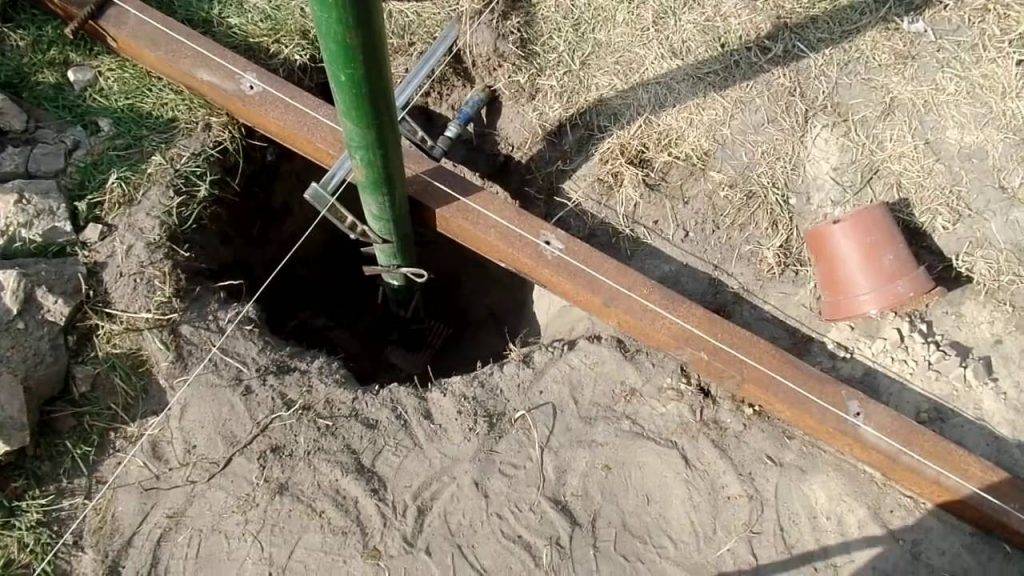 Опорные столбы могут быть смонтированы из кирпича, бревен или труб (металлических). Ямы для столбов роются примерно на 1,8 м в глубину и 30-50 см в ширину. Они засыпаются на 20-30 см песком и щебнем