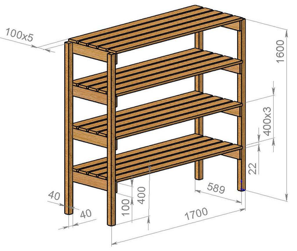 Для изготовления стеллажей следует подбирать бруски для стоек сечением 5 х 5 см, для перекладин: 5 х 3 см, доски — не менее 2 см толщиной (при использовании фанеры можно остановиться на листах толщиной 1 см).