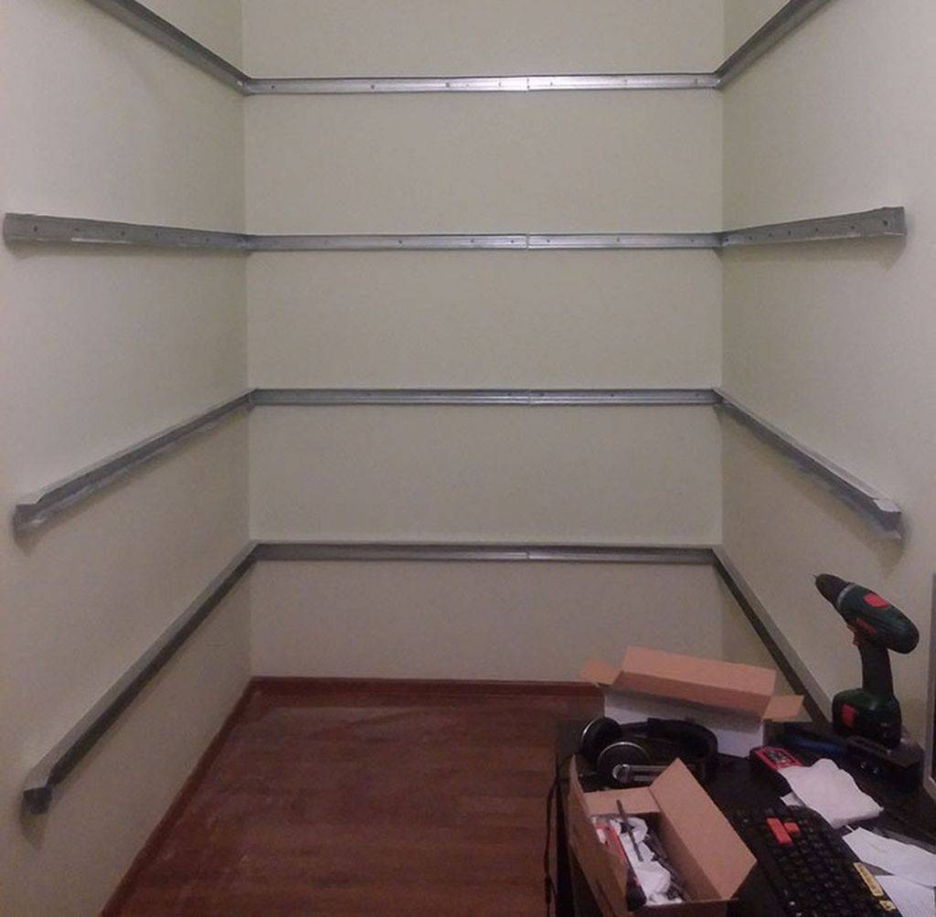 Для начала следует определиться с размерами сооружения. Его можно разместить вдоль всей стены или оборудовать местами хранения все стены.