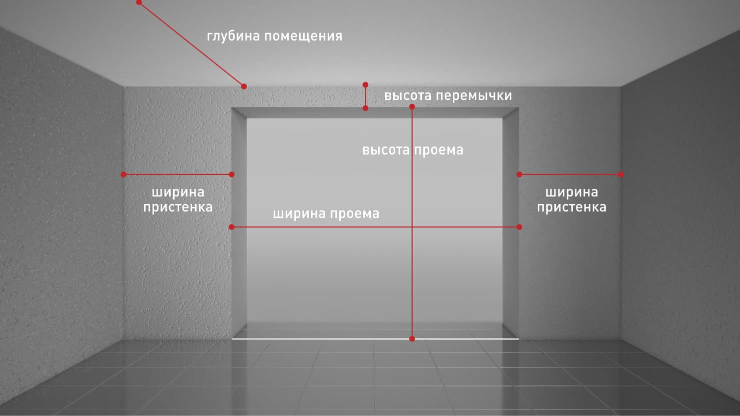 Боковые пристенки — расстояния от границ проема до боковых стен помещения. Они нужны для крепления вертикальных направляющих, по которым движется полотно при подъеме и опускании.